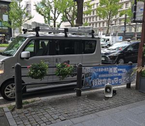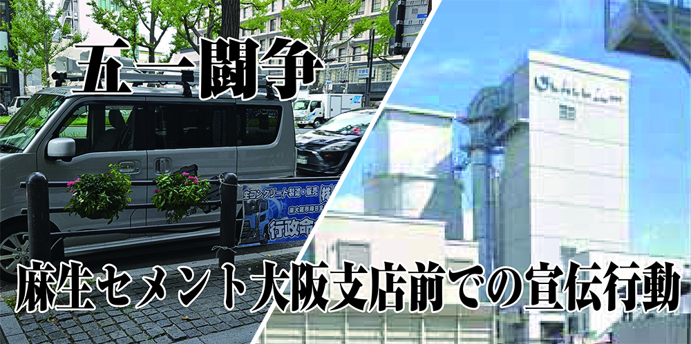 不当労働行為企業と労働委員会から認定された「株式会社五一」の周知と、「関生支部弾圧の不当性・異常な労組弾圧」の事実を周知するために、連帯ユニオン関生支部・大阪Bブロックは9月26日、背景資本の「麻生セメント㈱大阪支店」前で「五一社の不当労働行為を労働委員会が認定、関生支部弾圧事件を知って欲しい」などを掲げた情宣活動を展開しました。