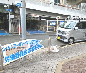 北区堂島の住友大阪セメント大阪支店が入居するアクア堂島正面玄関前の歩行者道路では、武谷副委員長が右手にマイクを握り、左手に組合旗を掲げて、山政生コン社が労働組合法に違反している不当労働行為の事実や、大阪府労働委員会から労働組合法に違反している「不当労働行為企業」に認定されたこと、中央労働委員会の再審査申立でも、「不当労働行為」が認定され救済命令が出されたこと、大阪広域生コン協組の関生支部潰しが背景にあることを訴えました。