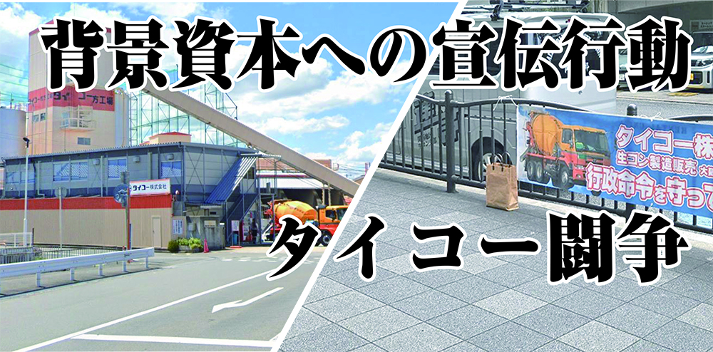大阪広域生コンクリート協同組合の関生支部潰しと連携したタイコー社の関生支部潰しを狙った不当労働行為・人権侵害を、私たち関生支部は断じて許すことはできません。