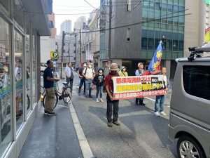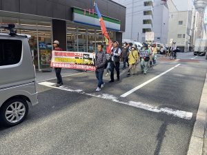 那須電機鉄工株式会社(本社、東京・新宿)の「不当労働行為糾弾。労働組合員への選別解雇、労働組合潰しを許さない。労使紛争を起こした責任を追及する」を掲げた港合同・昌一金属闘争、背景資本の三井住友銀行大阪本店に向けたデモ行進が10月14、大阪市中央区のオフィス街で開催され、支援者を含めた18人が結集しました。