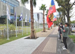 大阪広域生コンクリート協同組合テクノ・ラボ大阪前では、旗や幟がはためくスタンディングデモに大阪広域生コン協組の加盟企業経営者や職員が注目している姿や、大阪広域生コン協組の職員が、スタンディングデモの様子を撮影している姿が見られました。