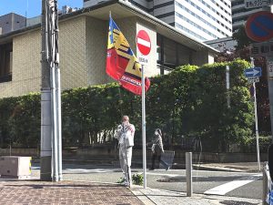 北区堂島の住友大阪セメント大阪支店が入居するアクア堂島正面玄関前の歩行者道路では、武谷副委員長が右手にマイクを握り、左手に組合旗を掲げて、山政生コン社が労働組合法に違反している不当労働行為の事実や、大阪府労働委員会から労働組合法に違反している「不当労働行為企業」に認定されたこと、中央労働委員会の再審査申立でも、「不当労働行為」が認定され救済命令が出されたこと、大阪広域生コン協組の関生支部潰しが背景にあることを訴えました。
