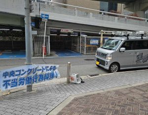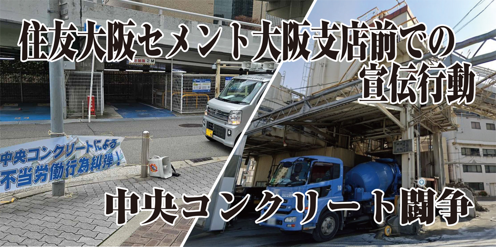 不当労働行為企業と労働委員会から認定された「中央コンクリート株式会社(代表取締役吉田要)」の周知と、「関生支部弾圧の不当性・異常な労組弾圧」の事実を周知するために、連帯ユニオン関生支部・大阪Bブロックは11月13日、背景資本の「住友大阪セメント株式会社大阪支店」前で「中央コンクリート社の不当労働行為を労働委員会が認定」「関生支部弾圧事件を知って欲しい」などを掲げた情宣活動を展開しました。