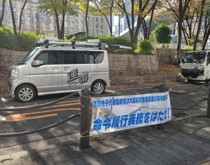 不当労働行為企業と労働委員会から認定された「㈱吉田生コン社」の周知と、「関生支部弾圧の不当性・異常な労組弾圧」の事実を周知するために、連帯ユニオン関生支部・奈良ブロックは11月20日、吉田生コン社の背景資本「㈱トクヤマ(セメント)大阪オフィス」前で「吉田生コン社の不当労働行為を労働委員会が認定した」「関生支部弾圧事件を知って欲しい」などを掲げた情宣活動を展開しました。