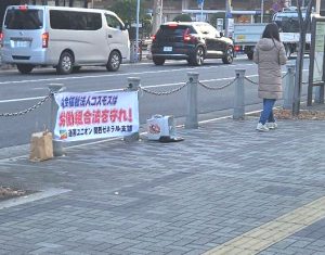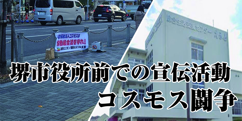 連帯ユニオン関西ゼネラル支部は11月17日、19日、20日、26日、28日の5日間、「社会福祉法人コスモスは、労働組合法を守れ!誠実な団体交渉を行え」を掲げて、堺市役所前で宣伝・ビラ配布活動を展開しました。