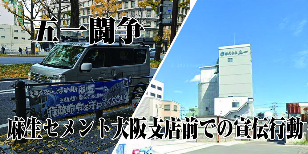 不当労働行為企業と労働委員会から認定された「株式会社五一」の周知と、「関生支部弾圧の不当性・異常な労組弾圧」の事実を周知するために、連帯ユニオン関生支部・大阪Bブロックは12月10日、背景資本の「麻生セメント㈱大阪支店」前で「五一社の不当労働行為を労働委員会が認定、関生支部弾圧事件を知って欲しい」などを掲げた情宣活動を展開しました。