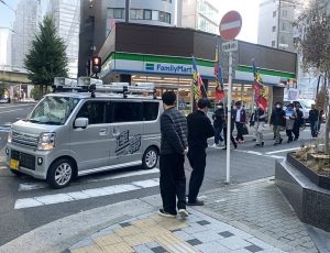 大阪広域生コンクリート協同組合テクノ・ラボ大阪前では、旗や幟がはためくスタンディングデモに大阪広域生コン協組の加盟企業経営者や職員が注目している姿や、大阪広域生コン協組の職員が、スタンディングデモの様子を撮影している姿が見られました。