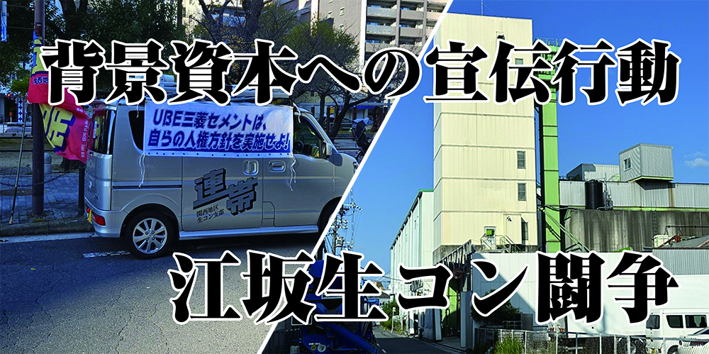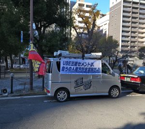 江坂生コン社が、従業員(ドライバー)を退職強要したことで、2025年8月20日に組合結成した関生支部との団体交渉を拒否していることの周知と、「関生支部弾圧の不当性・異常な労組弾圧」の事実を周知するために、連帯ユニオン関生支部・大阪Bブロックは12月18日、背景資本の「UBE三菱セメント株式会社大阪支店」前で「江坂生コンの団交拒否糾弾!」「関生支部弾圧事件を知って欲しい」などを掲げた情宣活動を展開しました。