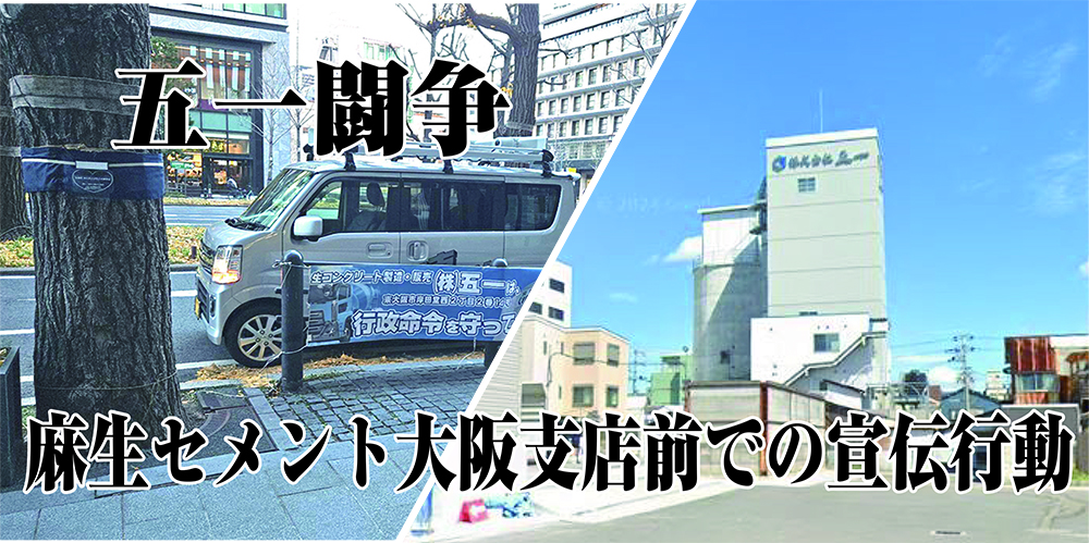 不当労働行為企業と労働委員会から認定された「株式会社五一」の周知と、「関生支部弾圧の不当性・異常な労組弾圧」の事実を周知するために、連帯ユニオン関生支部・大阪Bブロックは12月26日、背景資本の「麻生セメント㈱大阪支店」前で「五一社の不当労働行為を労働委員会が認定、関生支部弾圧事件を知って欲しい」などを掲げた情宣活動を展開しました。