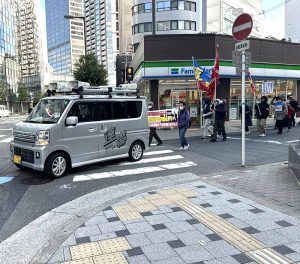 那須電機鉄工株式会社(本社、東京・新宿)の「不当労働行為糾弾、労働組合員への選別解雇、労働組合潰しを許さない、労使紛争を起こした責任を追及する」を掲げた港合同・昌一金属闘争、背景資本の三井住友銀行大阪本店に向けたデモ行進が、大阪市中央区のオフィス街で開催され、支援者を含めた20人が結集しました。