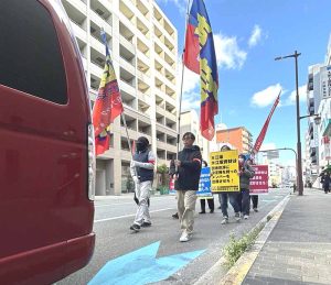 関生支部の宣伝カーを先頭に、旗がはためきプラカードを掲げ、関生支部・西山執行委員のアジテーションのデモ隊は、吹田市江の木町周辺の市民や会社員らの注目を集めました。