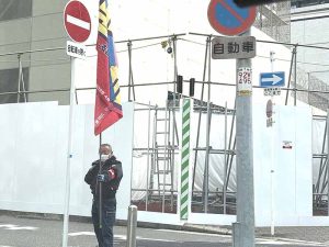 北区堂島の住友大阪セメント大阪支店が入居するアクア堂島正面玄関前の歩行者道路では、武谷副委員長が右手にマイクを握り、左手に組合旗を掲げて、山政生コン社が労働組合法に違反している不当労働行為の事実や、大阪府労働委員会から労働組合法に違反している「不当労働行為企業」に認定されたこと、中央労働委員会の再審査申立でも、「不当労働行為」が認定され救済命令が出されたこと、25年11月には、東京地裁も不当労働行為を認定したこと、大阪広域生コン協組の関生支部潰しが背景にあることを訴えました。