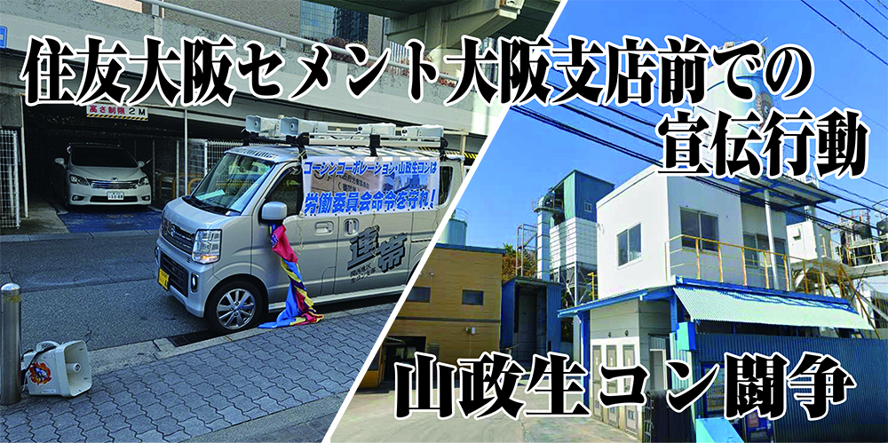 不当労働行為企業と労働委員会から認定された「コーシンコーポレーション・山政生コン社」の周知と、「関生支部弾圧の不当性・異常な労組弾圧」の事実を周知するために、連帯ユニオン関生支部・大阪Cブロックは1月28日、背景資本の「住友大阪セメント株式会社大阪支店」前で「山政生コン社の不当労働行為を労働委員会が認定」「関生支部弾圧事件を知って欲しい」などを掲げた情宣活動を展開しました。
