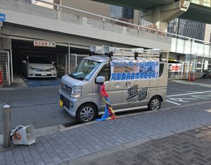 北区堂島の住友大阪セメント大阪支店が入居するアクア堂島正面玄関前の歩行者道路では、武谷副委員長が右手にマイクを握り、左手に組合旗を掲げて、山政生コン社が労働組合法に違反している不当労働行為の事実や、大阪府労働委員会から労働組合法に違反している「不当労働行為企業」に認定されたこと、中央労働委員会の再審査申立でも、「不当労働行為」が認定され救済命令が出されたこと、25年11月には、東京地裁も不当労働行為を認定したこと、大阪広域生コン協組の関生支部潰しが背景にあることを訴えました。
