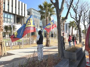 大阪広域生コンクリート協同組合テクノ・ラボ大阪前では、旗や幟がはためくスタンディングデモに大阪広域生コン協組の加盟企業経営者や職員が注目している姿や、大阪広域生コン協組の職員が、スタンディングデモの様子を撮影している姿が見られました。