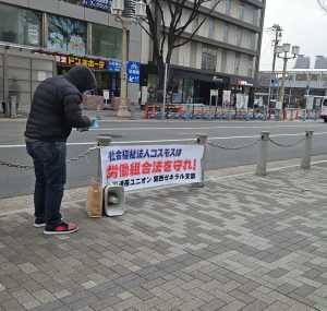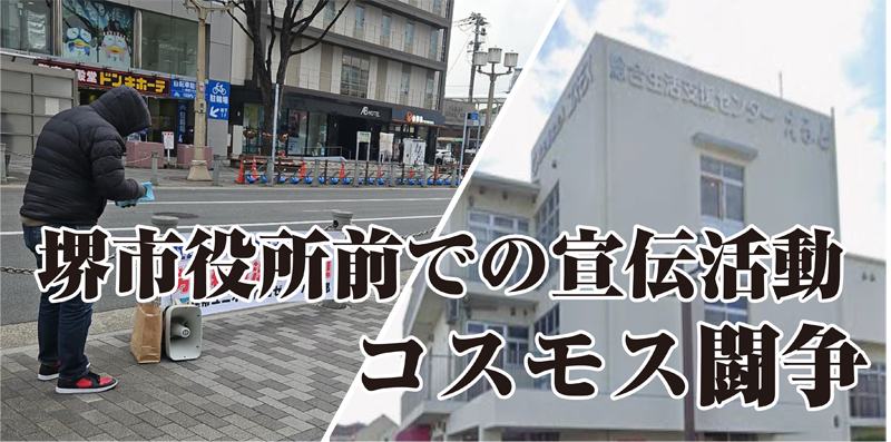 連帯ユニオン関西ゼネラル支部は2月16日と20日の2日間、「社会福祉法人コスモスは、労働組合法を守れ、誠実な団体交渉を行え」を掲げて、堺市役所前で宣伝・ビラ配布活動を展開しました。
